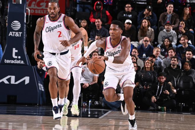 再看加蘭,他在場時,泰倫盧可以像使用歐文一樣使用他,快船的節奏更快,每48分鍾回合數來到103,快船百回合能狂轟131.6分;出戰的5場比賽,快船5戰0負,場均數據17.8分5.8助攻2.4籃板,3分命中率46%,場均命中3.4個3分,投籃命中率47%。對於加蘭與倫納德這對組合,泰倫盧給出這樣的評價,首先對手不敢再肆無忌憚的包夾倫納德,其次給倫納德配一個速度更快的後衛,倫納德的速度也會更快!而快起來的倫納德更有威脅。