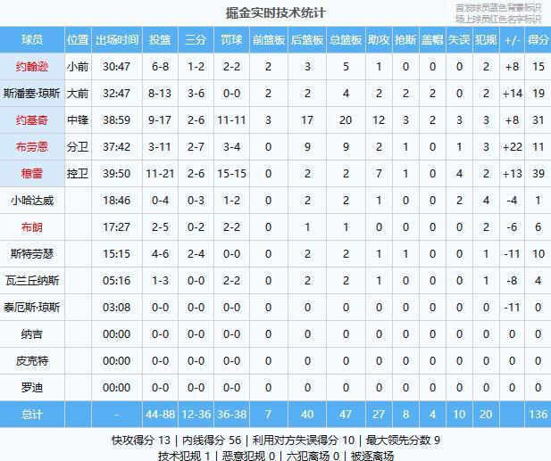 穆雷39分2板7助、約基奇31分20板12助3斷2帽、斯潘塞·瓊斯19分4板2助2斷2帽、約翰遜15分5板1助、布勞恩11分9板2助、斯特勞瑟10分2板1助、布朗6分1板、瓦蘭丘納斯4分2板1助