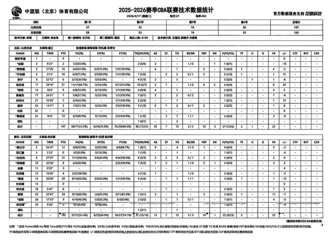 北京時間2026年3月17日19:35,2025-2026賽季常規賽第27輪繼續進行,山西汾酒主場迎戰北京控股。兩隊曆史上共交手23次,山西汾酒13勝10負,上賽季兩隊交手2次,山西汾酒1勝1負。本場比賽,山西隊上半場發揮出色,全隊用積極的態度建立起大比分領先優勢,下半場有所鬆懈,防守注意力不夠集中,對籃板球的保護做得也不夠好,給了對手太多追分機會,需繼續總結。最終全場比賽結束,山西汾酒107:102戰勝北京控股。
